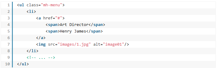 Each menu item (which is a unordered list item in this case) will have an anchor containing two spans and an image: