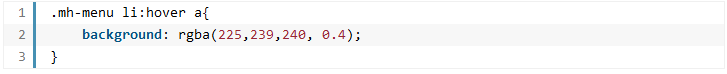 We’ll give .mh-menu li a display block and rgba(255,255,255, 0.8) as background color. When we hover over a list item, we’ll color the background into rgba(225,239,240, 0.4) which is a light blue: