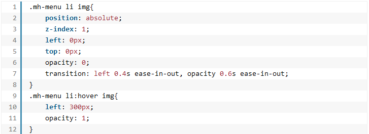 The image will slide to the right side, so initially, it will have a left of 0px. We’ll also add a transition for its opacity; it will animate from 0 (initial value) to 1:
